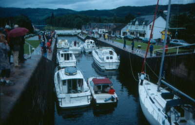 gut gefüllte Schleusenkammer in Fort Augustus in dem Augenblick, in dem die Boote von einer in die nächste Kammer verlegen.